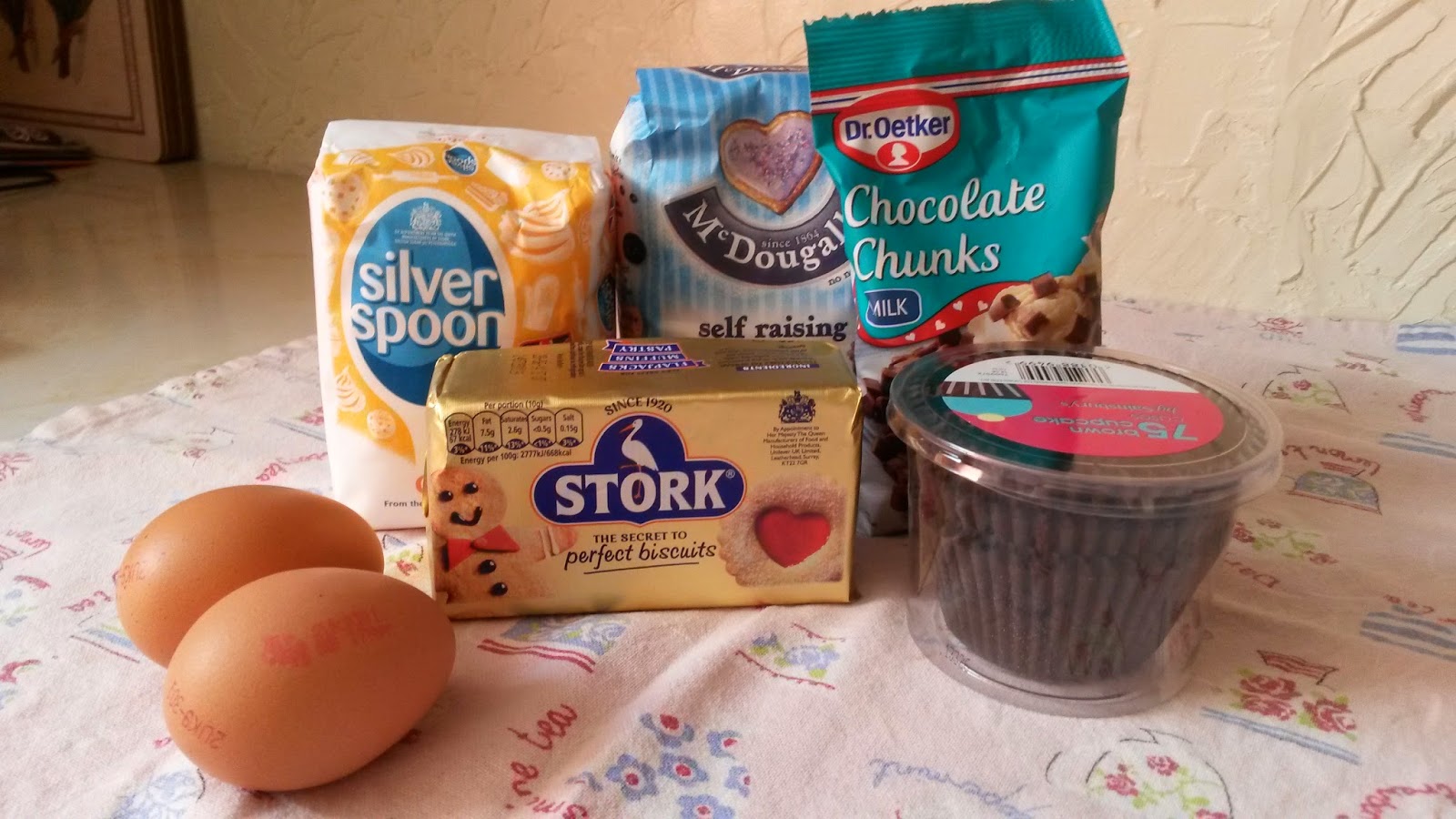 Put the Margarine, sugar, eggs and flour into a mixing bowl and using an electric whisk, beat together until just smooth. Fold in the chocolate chips, spoon the mixture into the paper cases.